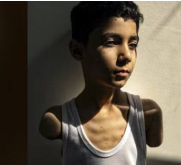 بازوں سے محروم ہونے والے فلسطینی بچے کی تصویر فوٹو آف دی اٸیر